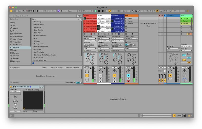 In order to maintain the idea of video game character sound, the first step of this process was to gather the Foley recordings taken, place them into an Ableton Live session and build a Generative audio track with each chosen material. With the parameters set for each recording to happen at about a 60-80% chance of following the previous footstep, this ensures that the chance of the same two footsteps following after one another is low. After generating around 17/18 minutes worth of these footsteps, the next step was to decide sections where the terrain material would switch, even further enhancing the variety in steps made. Initially the tracks for each material had been automated to mute the track allowing for the one chosen as the centre piece in their moment however, I quickly realised that the switch in tonality between these steps created a gulf in quality for the piece. It was then I decided to maintain the 'concrete' material track as a constant throughout, but used automation to lower the amplitude where other terrain steps were to be the indicator of a switch in the characters zone.